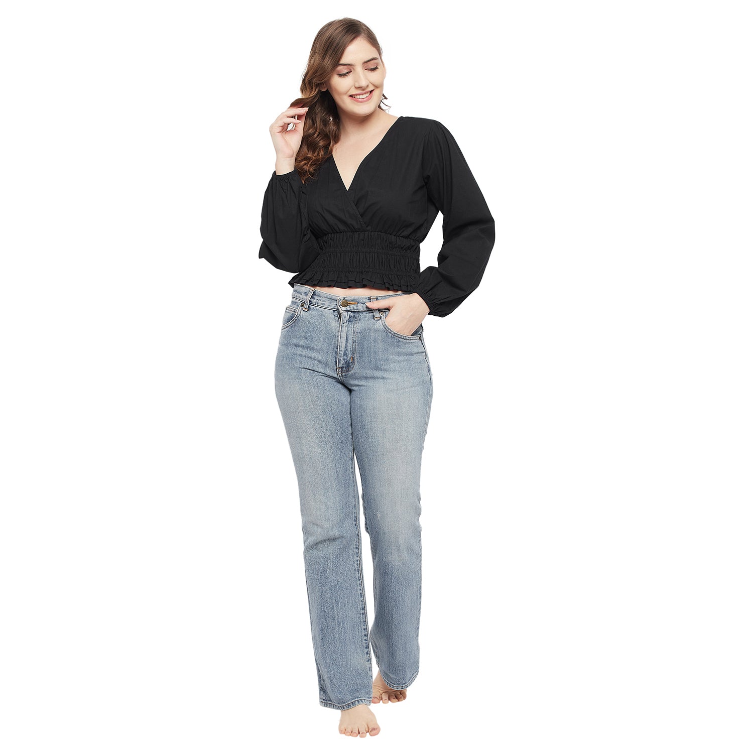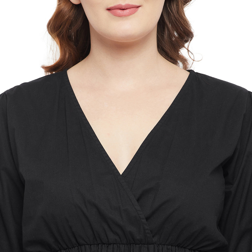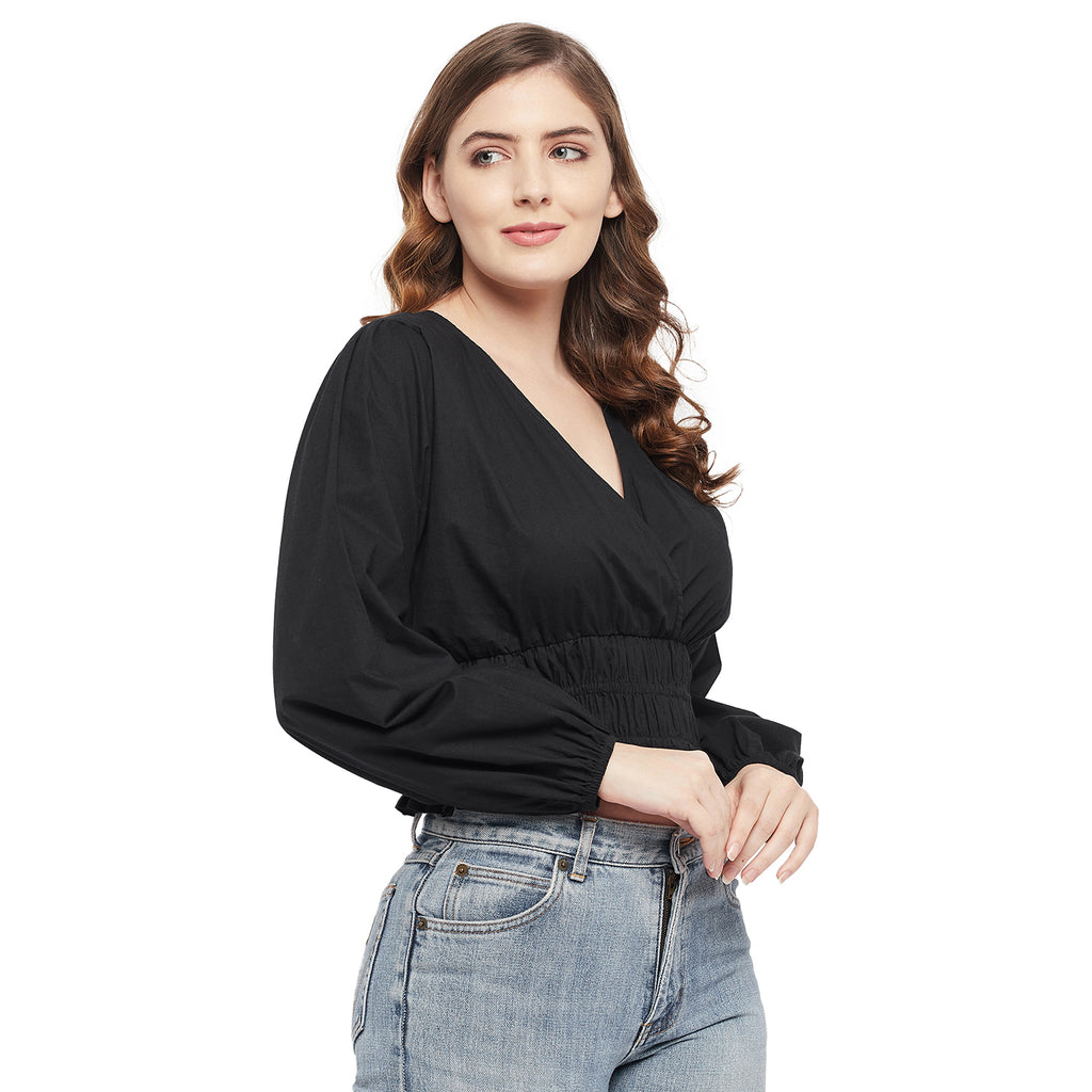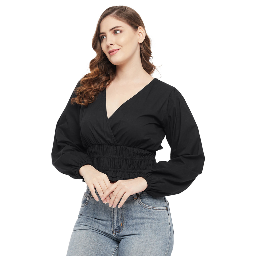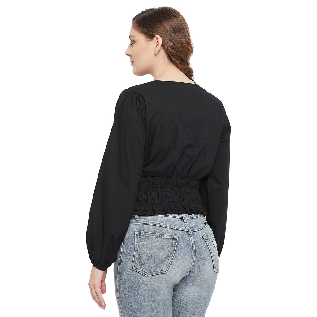 BLACK POPLIN CINCH WAIST TOP