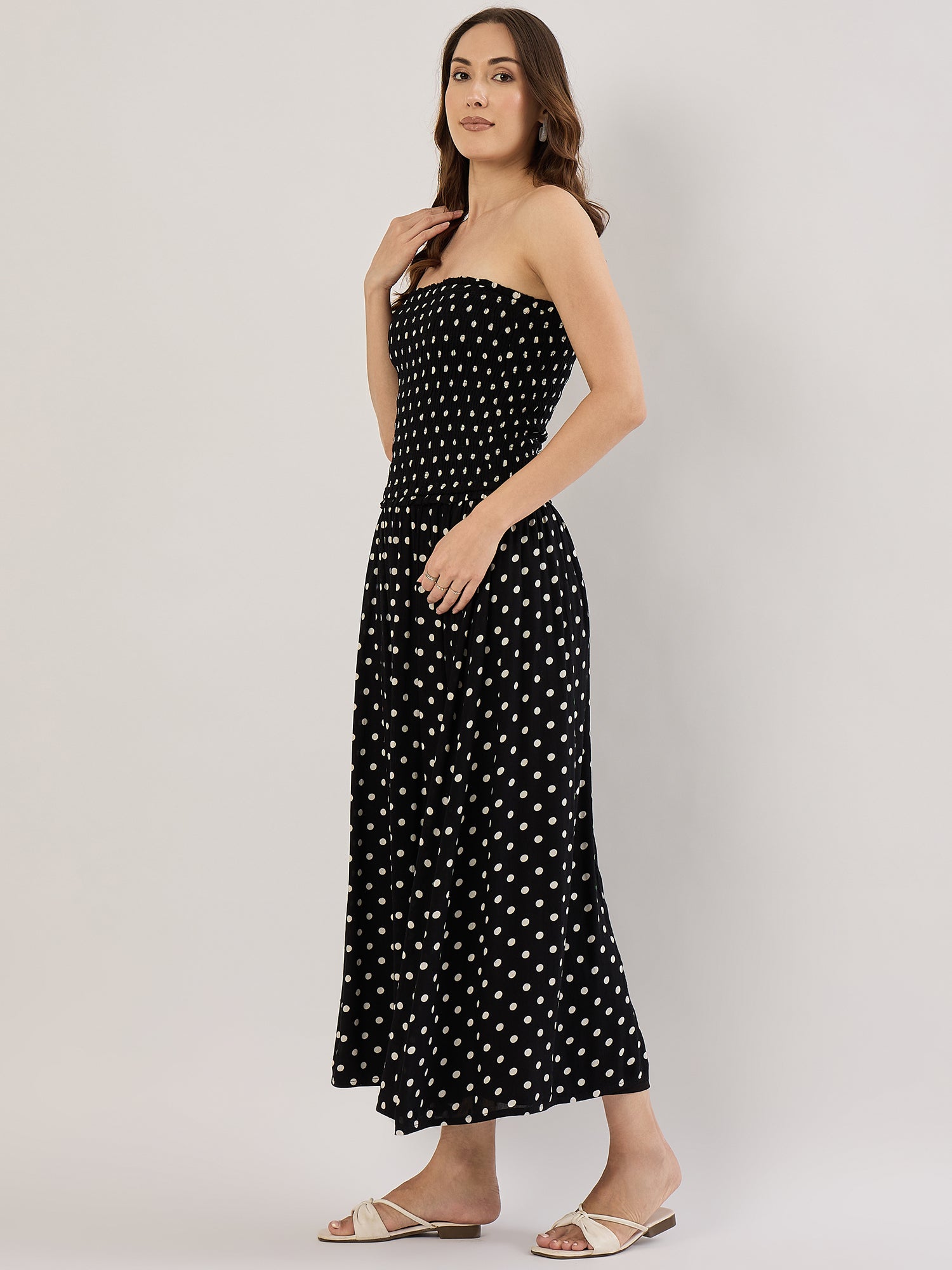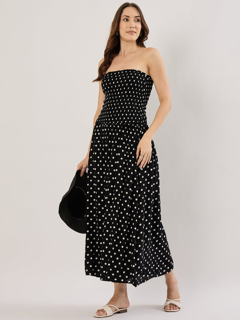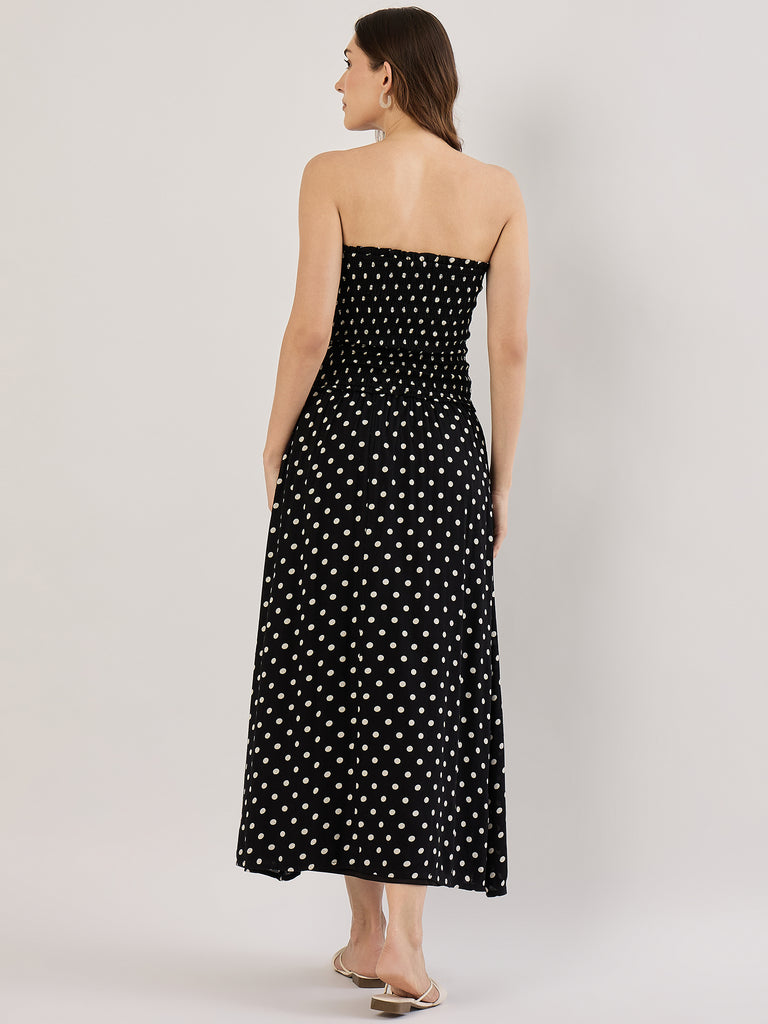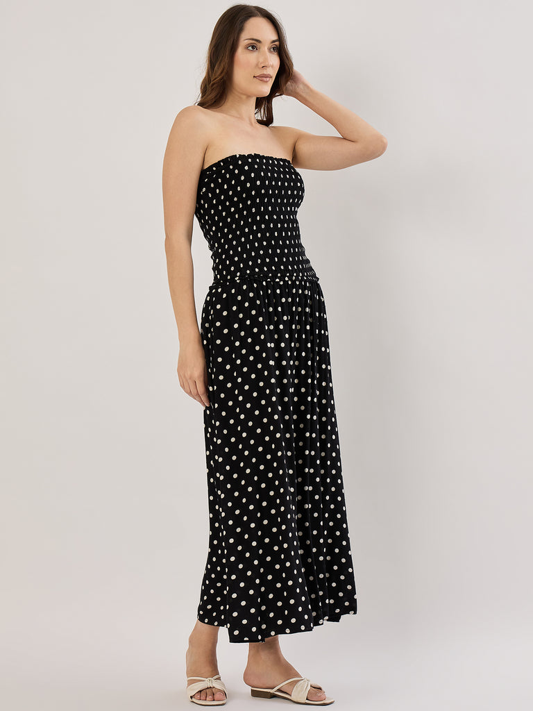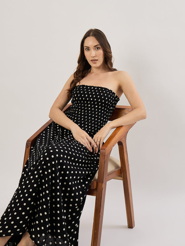 BLACK/WHITE DOT SMOCK STRAPLESS MAXI
