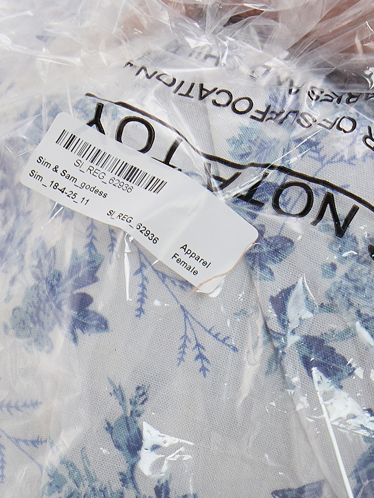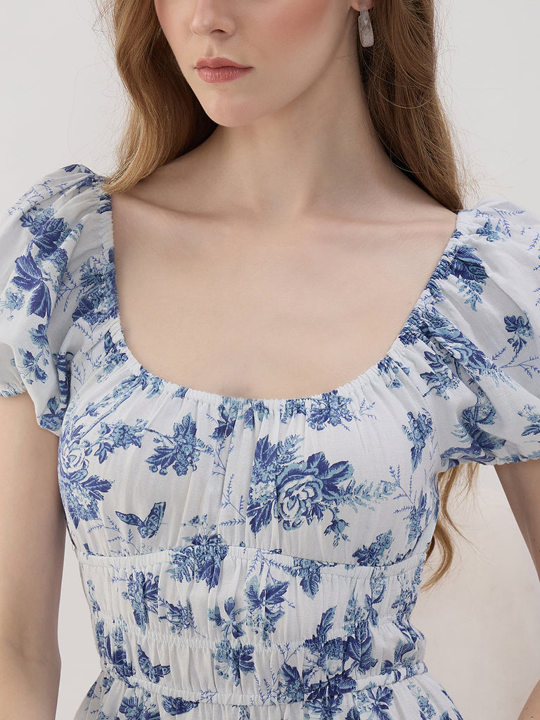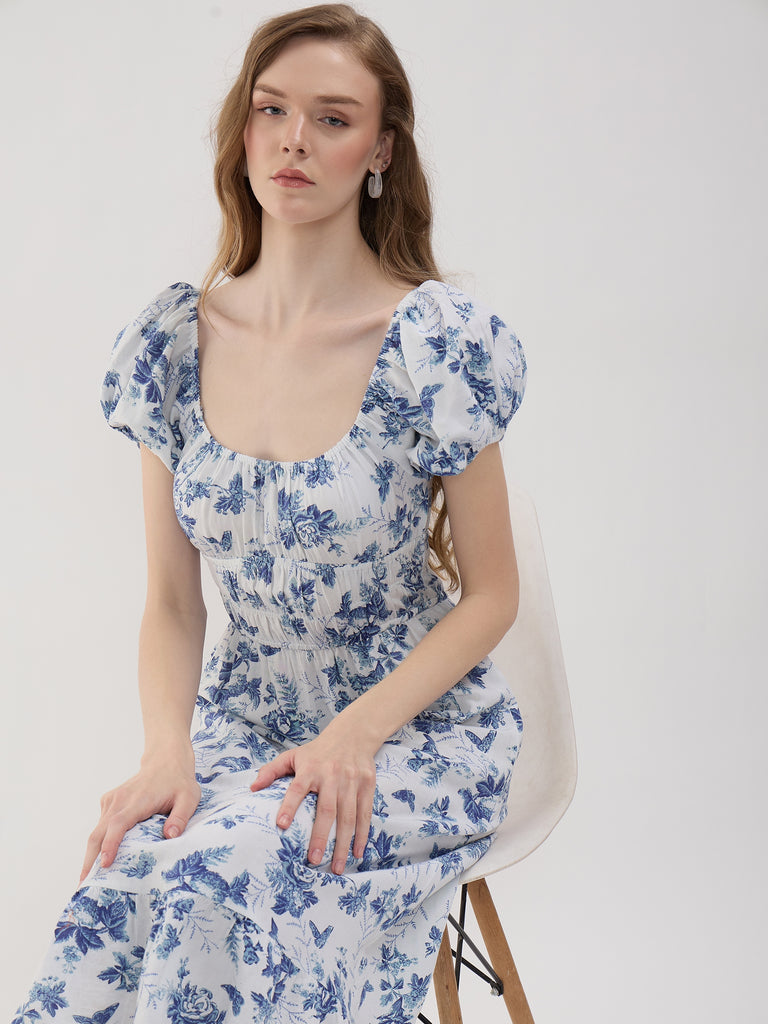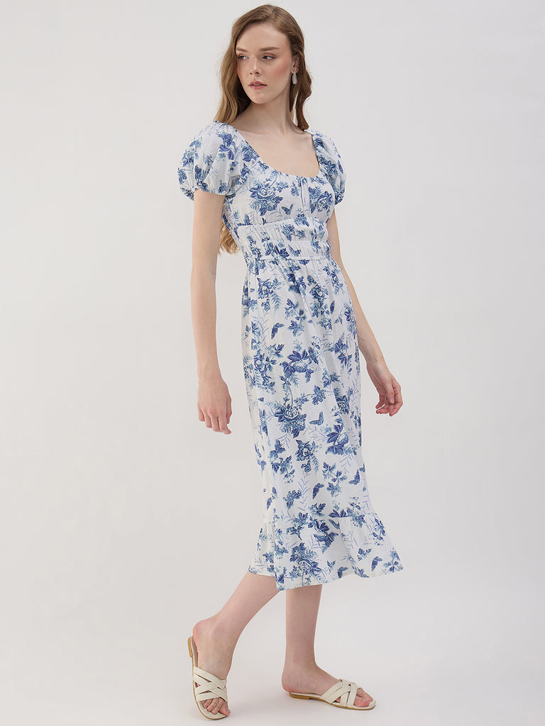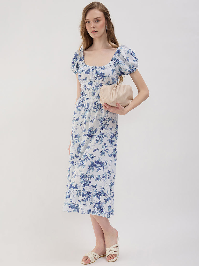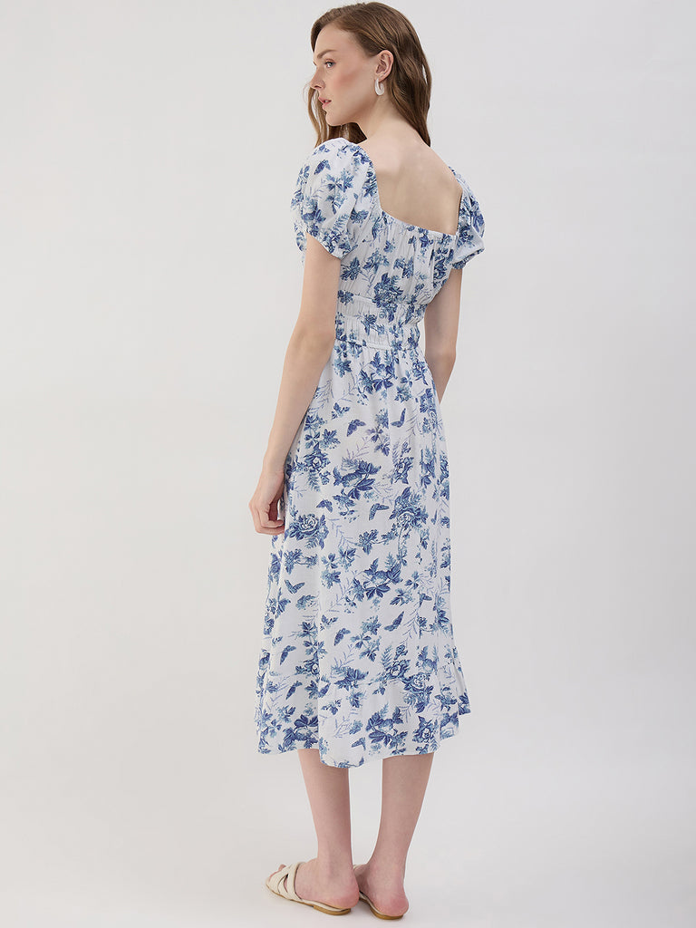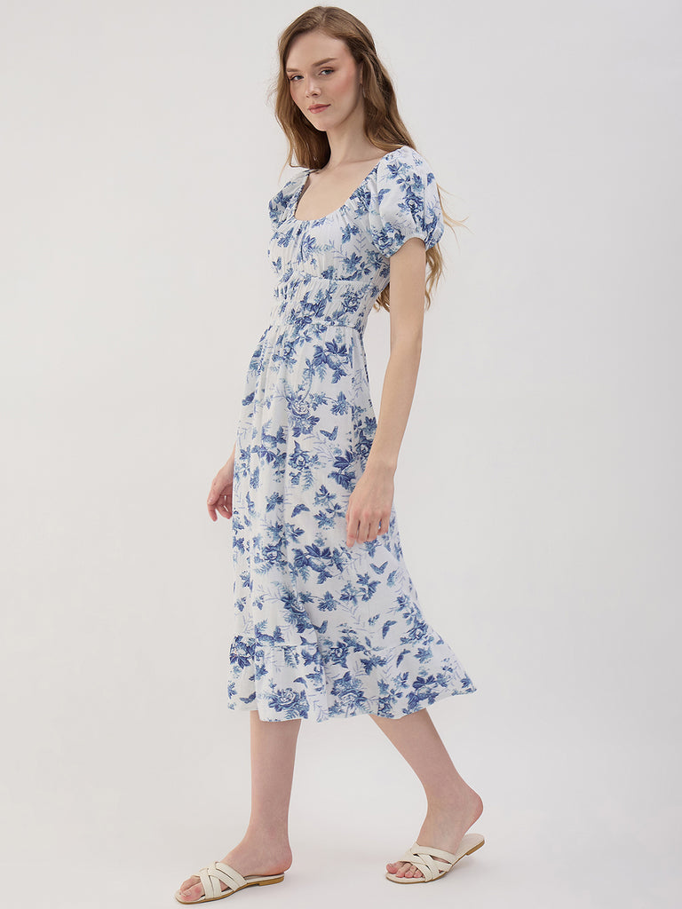 BLUE FLORAL SS SMOCK LINEN MIDI