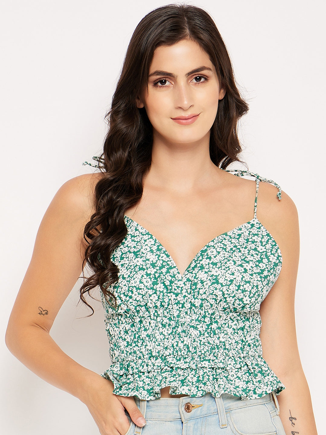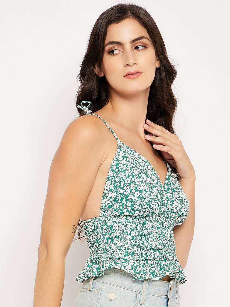 SHADY GREEN WHITE DITSY POPLIN SMOKED WAIST TANK TOP