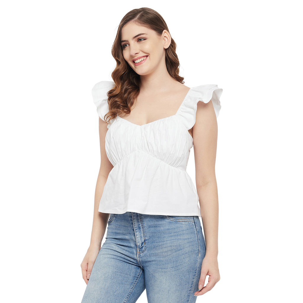 WHITE POPLIN RUCH BUST FLUTTER TOP